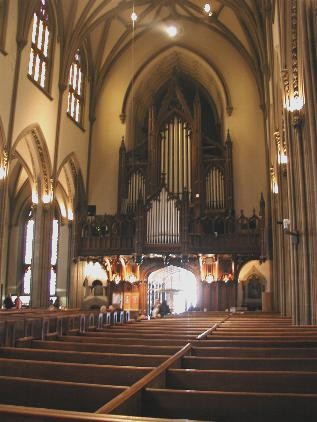In 1859, numerous attempts were made to move the choir into the chancel, all of which were met with considerable resistance. On March 18, the first full service was sung from the chancel, and by Easter Day, the choir was permanently installed there. The constant problems caused by the distance of the newly positioned choir from the gallery organ caused the Vestry to engage the firm of Hall and Labagh to build a small accompanying instrument of fifteen stops in the chancel. This instrument was finished in 1864. Two organists were then required for all choral services. Significant changes and repairs were made to the Erben organ in 1867, 1889 and 1907.