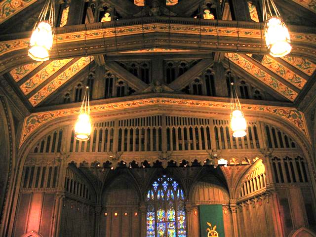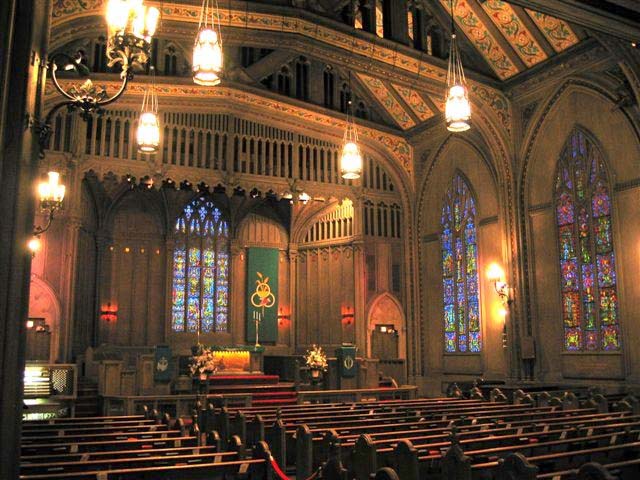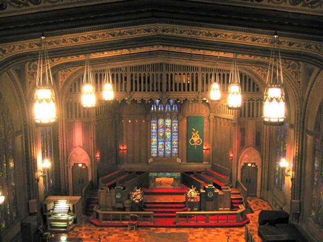 Source: Shop notes via Allen Kinzey; The Diapason, August 1923 Photo 1 Source: Stop, Open & Reed, via Jonathan Bowen Photos 3-5 Source: Jeff Scofield Notes: The 4-manual, 64-rank Skinner was installed in 1924. The church takes up the bottom four floors of a 26-story, 568' tall building that is crowned with a tall French Gothic steeple. The 1000-seat sanctuary is grotto-like – very dark, with medium-brown walls. In the 1980's, after catastrophic water damage, Wicks rebuilt and enlarged the organ to 92 ranks, as well as adding a new console. Organ Historical Society Database: https://pipeorgandatabase.org/OrganDetails.php?OrganID=22822 |