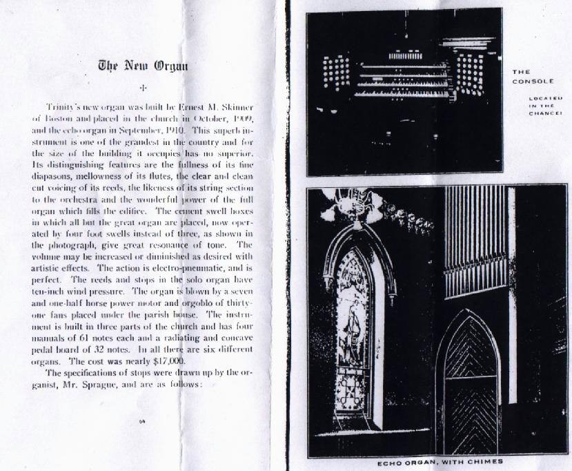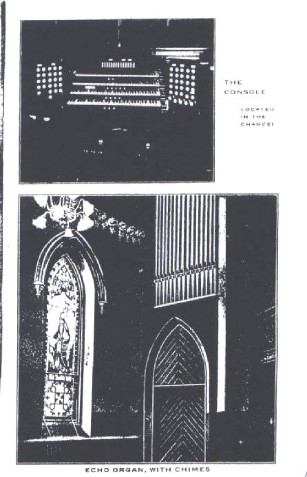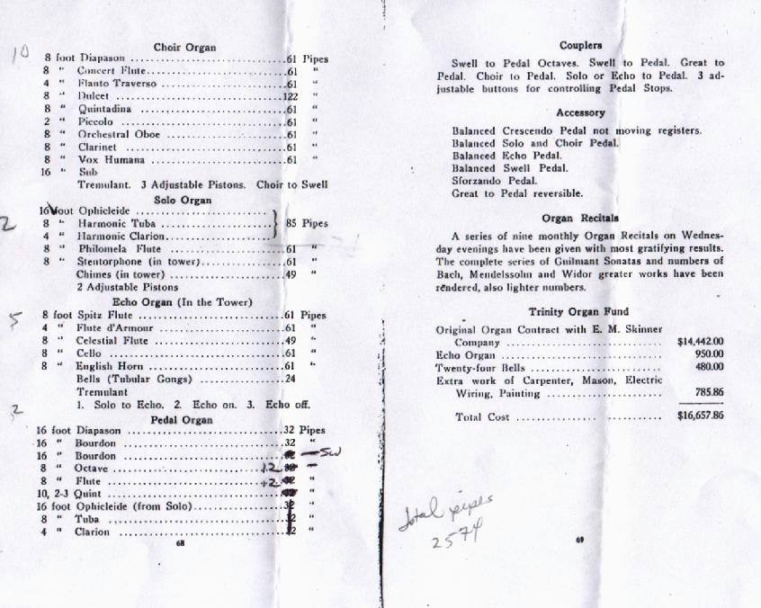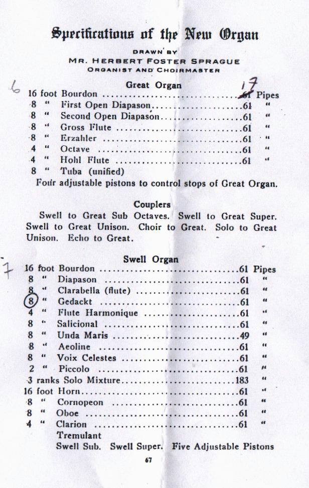 8' Second Diapason 61 8' Gedeckt 73 8' Claribel Flute 61 8' Salicional 73 4' Octave 61 8' Voix Celeste 73 4' Flute 61 8' Flute Celeste II 134 2' Fifteenth 61 8' Echo Dulcet 73 IV Mixture 244 4' Octave 73 8' Tromba 61 4' Flute Triangulaire 73 4' Clarion 61 III Mixture 183 Chimes SO 16' Waldhorn 73 8' French Trumpet 73 CHOIR ORGAN 8' Fagotto 73 8' Gamba 73 8' Vox Humana 73 8' Concert Flute 73 Tremolo 8' Kleine Erzähler II 146 8' Tuba Mirabilis SO 4' Flute 73 8' French Horn SO 2' Piccolo 61 8' English Horn SO 8' Clarinet 73 Chimes SO Tremolo 8' Harp (TC) -- 8' Salicional SW 4' Celesta 61 bars 8' Voix Celeste SW 8' Flute Celeste II SW PEDAL ORGAN Harp (TC) SW 16' Diapason 32 Celesta SW 16' Violone 32 16' Bourdon 32 SOLO ORGAN 16' Echo Bourdon SW 8' Gamba 73 8' Octave 12 8' Gamba Celeste 73 8' Cello 12 8' Tuba Mirabilis 73 8' Gedeckt 12 8' French Horn 73 8' Still Gedeckt SW 8' English Horn 73 4' Super Octave 12 8' Vox Humana 73 4' Gedeckt 12 Tremolo 4' Still Gedeckt SW Chimes 25 tubes 16' Trombone 32 16' Waldhorn SW 8' Tromba 12 4' Clarion 12
