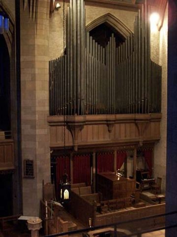 Notes: From the booklet for the 1999 Worcester Regional Convention: Wesley Methodist Church was a merger in 1923 of Grace Methodist and Trinity Methodist (old First Methodist Church). The Neo-Gothic building was designed by Coolidge and Carlson of Boston. The building and the new George C. Bryant Memorial Organ were dedicated on May 8, 1927. Organist A. Leslie Jacobs collaborated with William E. Zeuch in the design of the organ. The 68-rank organ was constructed in a divided chancel arrangement, with GT/SW/CH/SO left and PD right; ANTIPH/ECHO in the rear. The Antiphonal shades opened into the left gallery through a grill. Three Echo shades opened into the tower stairwell. There were separate chimes in the Solo and Antiphonal divisions. The Swell IV mixture was replaced in 1927 and again in 1930. It was replaced again in the 1955 rebuild supervised by G. Donald Harrison and done as 615-A and 615-B. This rebuild also included the following: Pedal – New III Mixture (on Chimes knob) and 4' Octave revoiced; Great – New 4' and 2' Principals, IV Mixture reworked with some new pipes, 16' Quintaton replaced 16' Open Diapason. In 1970, the Berkshire Organ Co. added 6 new stops (5 replacing old stops), no other revoicing. Most changes were in the Choir - 8' Open Diapason replaced by a II Sesquialtera, and 8' Concert Flute replaced by a Gedeckt. Organ Historical Society Database: https://pipeorgandatabase.org/OrganDetails.php?OrganID=9352 |