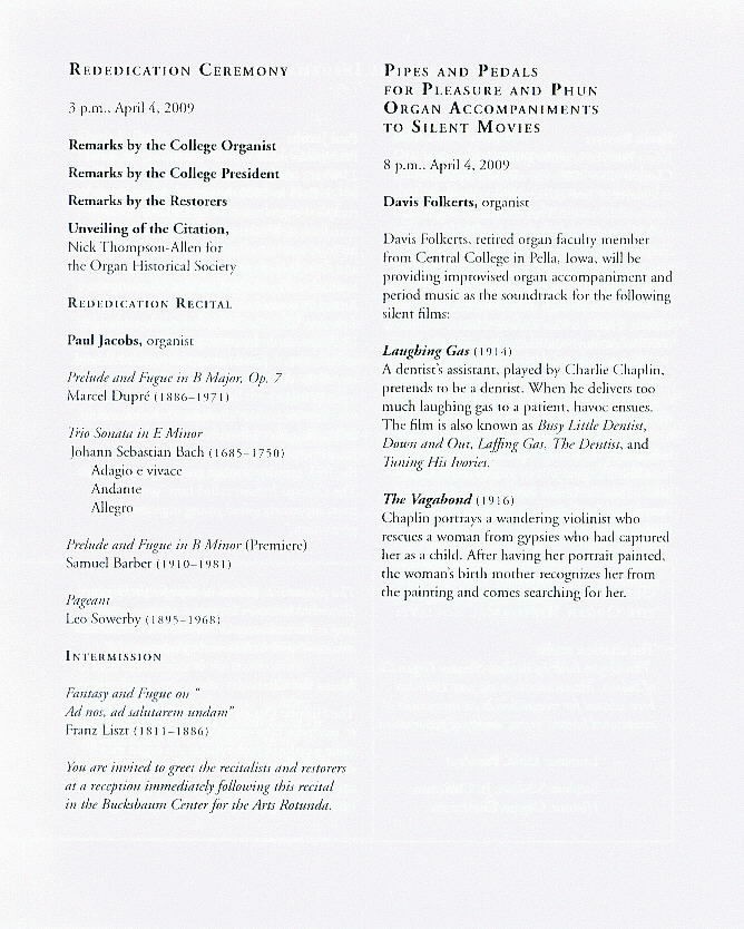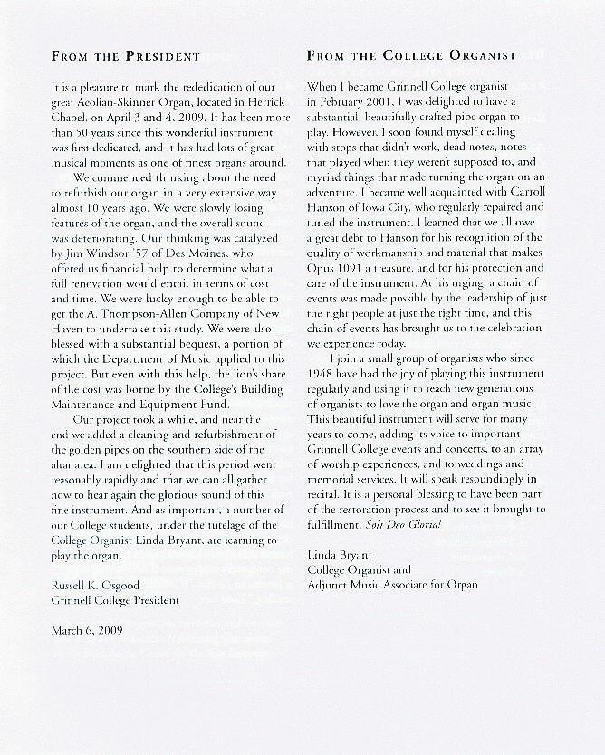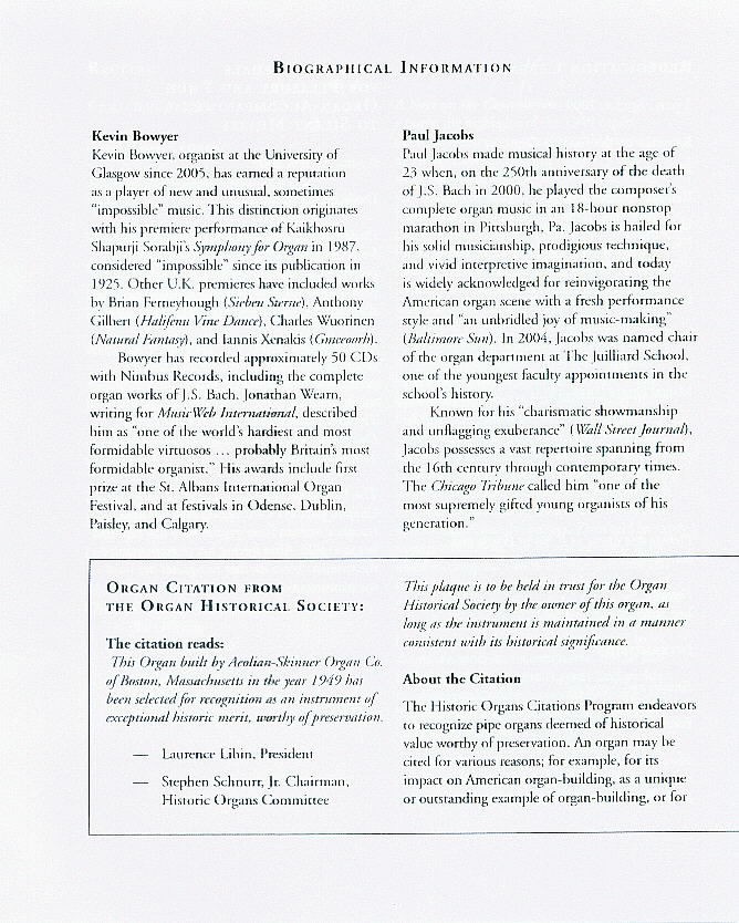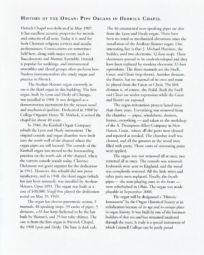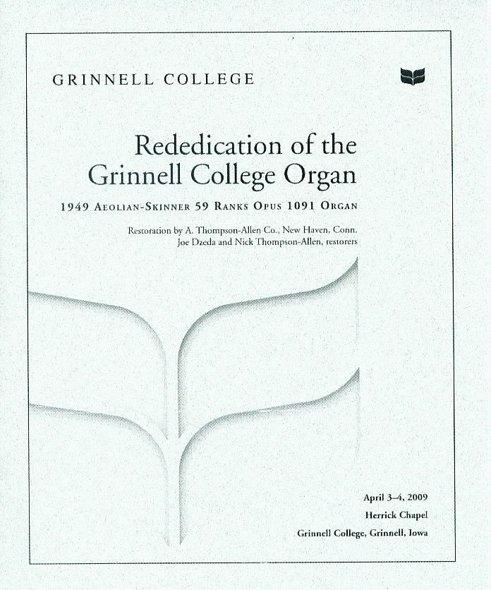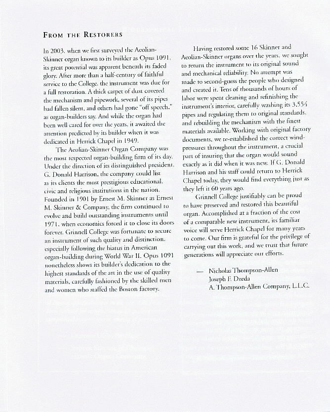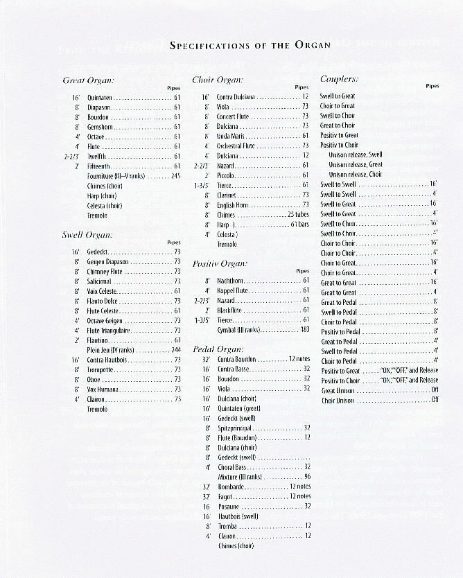 Builder: Aeolian-Skinner Organ Co, Inc. Year: 1946 Opus: 1091 No. manuals: 3 No. stops: 62 No. ranks: 59 No. pipes: 3,554 Specification GREAT ORGAN SWELL ORGAN