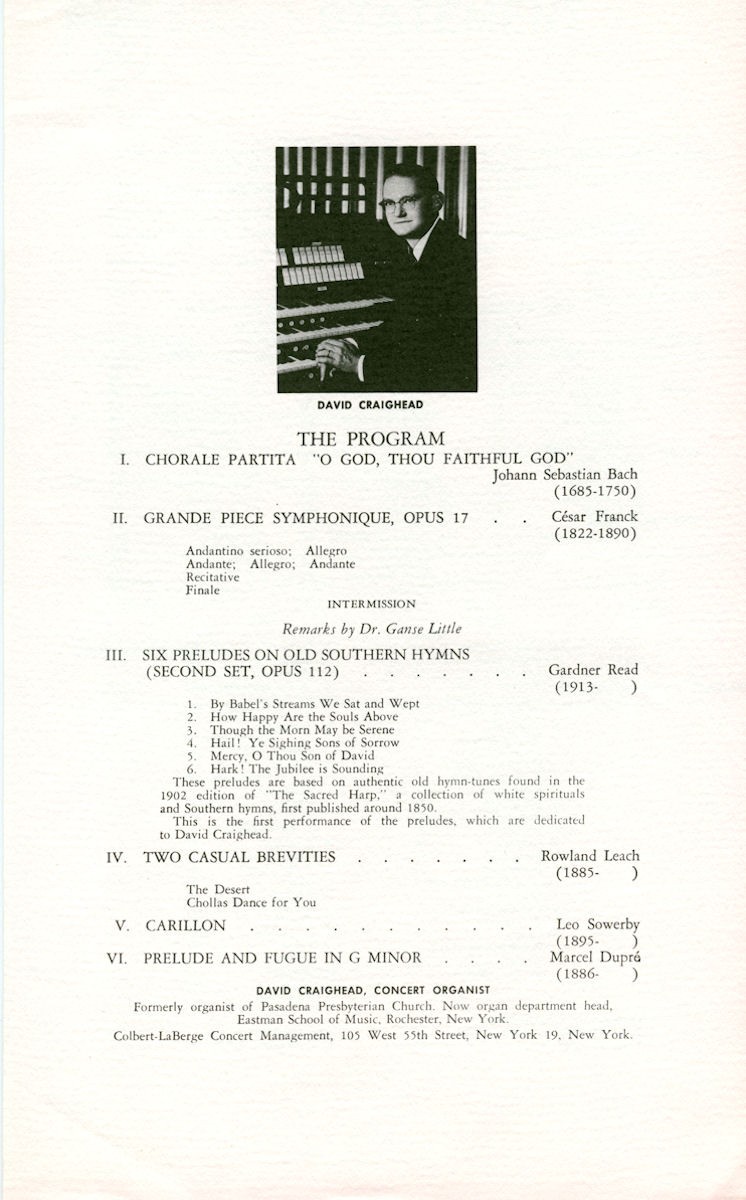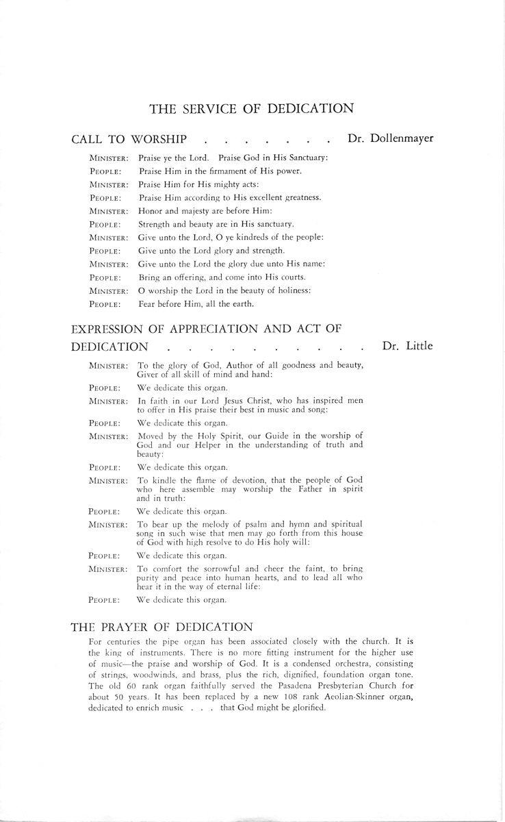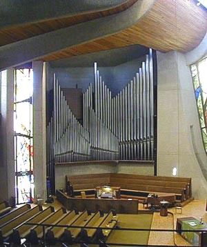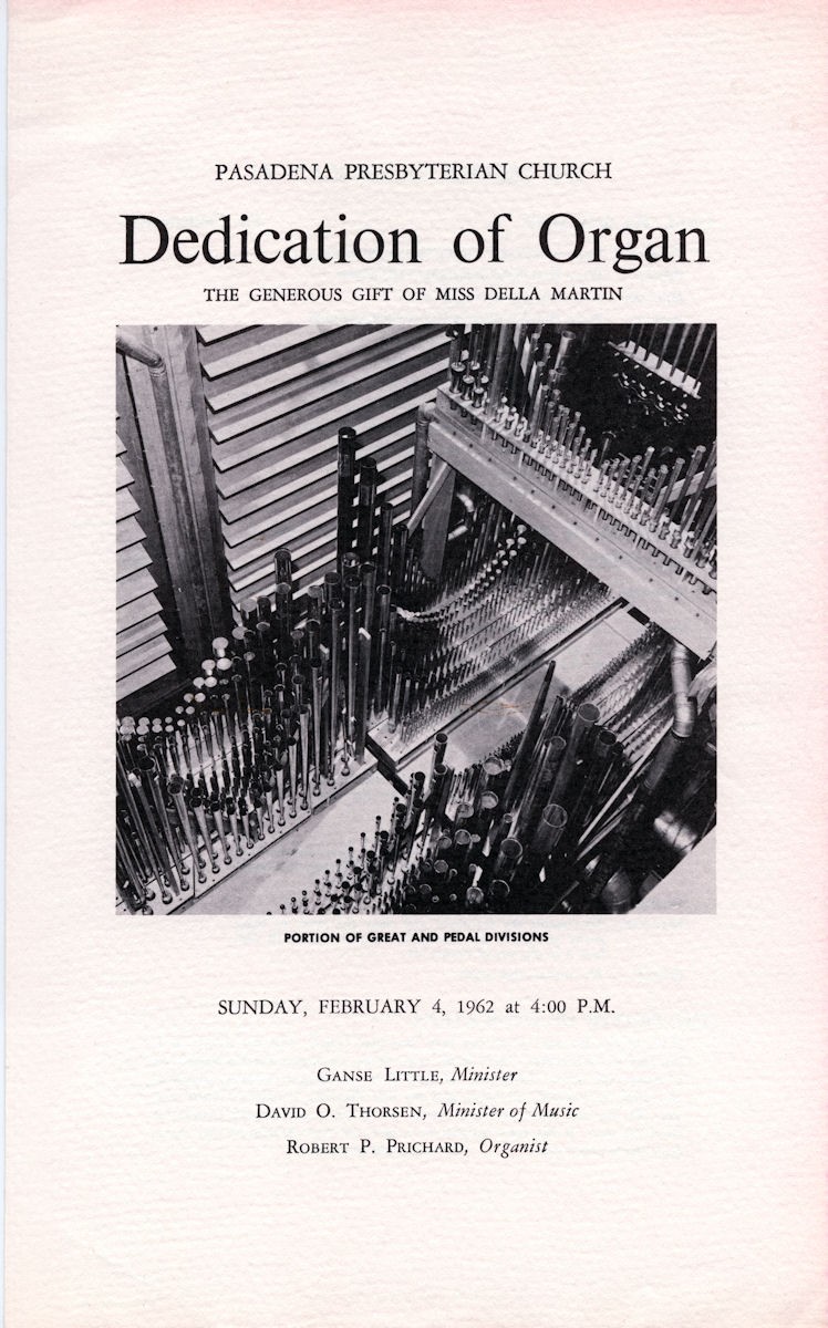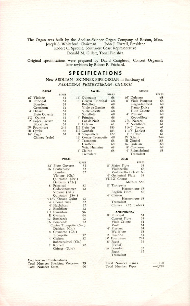 Source: Dedication Program Photo 5 Source: Murray M. Harris and Organ Building in Los Angeles, 1894-1913, by David Lennox Smith and edited by Orpha Ochse, photo by Jim Lewis; available through the Organ Historical Society. Photos 6-9 Source: Jim Stettner Notes: In 1948, Aeolian-Skinner installed a new console as Op. 1131 for the existing 1905 Murray Harris organ in the old sanctuary. From 1957-1960 Aeolian-Skinner installed a new organ as Op. 1131-A and soon thereafter the Antiphonal and Antiphonal Pedal as Op. 1131-B. Only the 32' Flute Ouverte was retained from the Murray Harris organ. Due to earthquake damage, the 1905 sanctuary was replaced in 1976 by a new 900-seat sanctuary. Casavant moved the organ to the new building, where it is functionally installed in the contemporary building. Casavant also created a new façade made up of the 32' Principal and 16' Octave. Due to the design of the new building, the Antiphonal divisions did not make the move and were placed in storage. Organ Historical Society Database: https://pipeorgandatabase.org/OrganDetails.php?OrganID=25334 |