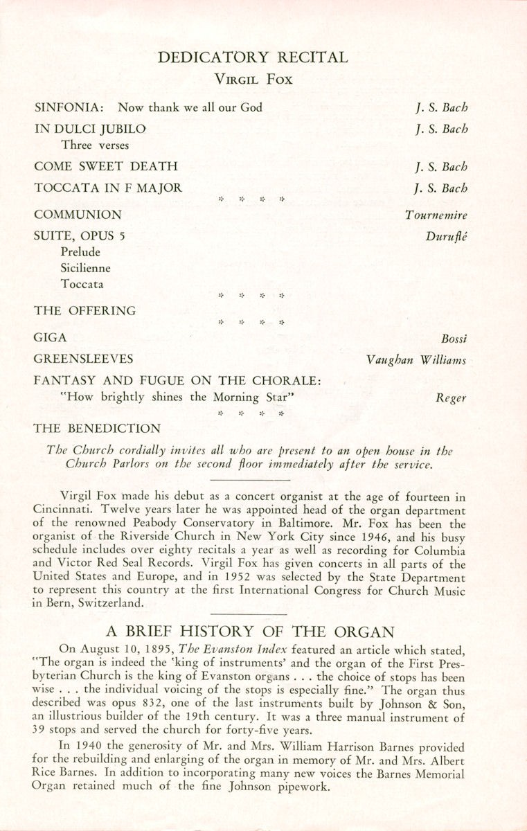 Photos 1, 3, 5-8 Source: Jim Stettner Notes: The original organ was Johnson Op. 823 installed in 1895. Holtkamp rebuilt t he organ in 1940 as the Barnes Memorial Organ. Aeolian-Skinner made "judicious reuse of some ranks" for Op. 1321. Casavant added a Trompette en Chamade in 1978, which has since been removed. The instrument was altered in 1985. Organ Historical Society Database: