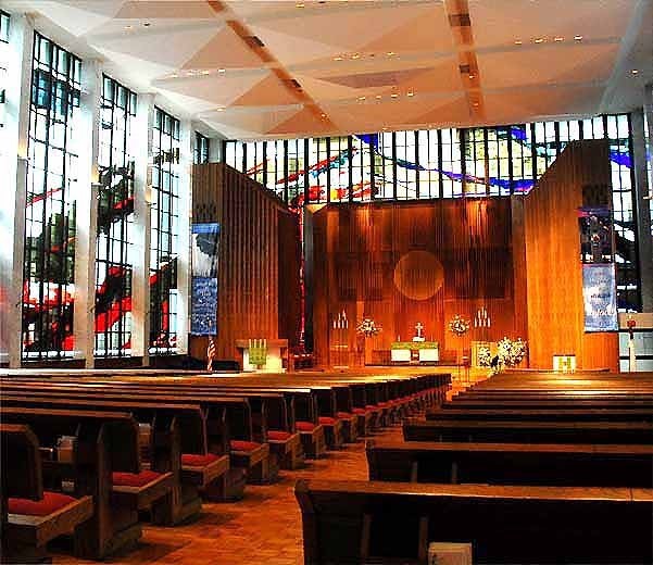 by three walls of stained-glass windows in the large rectangular contemporary