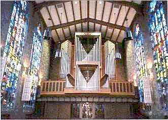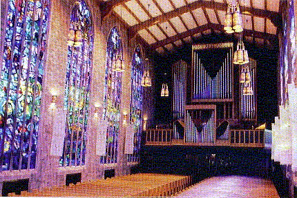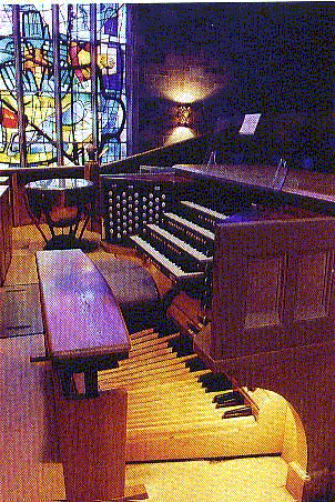 Source: The Diapason, with clarification by Allen Kinzey Photos 1, 3-4 Source: Stephen Schnurr, Pipe Organs of Chicago Photo 5 Source: Neal Campbell Notes: When the Celeste 4 and Schwebung 4 couplers are drawn, they put on the unison and celeste ranks in their respective divisions plus a 4' coupler. However, once one draws another stop in the division, the 4' coupler goes off. The organ is installed in the rear gallery of the chapel, which has a 60-foot ceiling. The Positiv is placed in the Ruckpositiv position on the rail. The Brustwerk is at the first level of the case and has doors which can be opened from the console. The Great is on the second level with the 16' Violone in front. The Récit is on the upper level with visible expression shades forming a part of the architectural design. The Fanfare Trumpet is of upright hooded pipes. Twin towers hold the Pedal pipes. Organ Historical Society Database: https://pipeorgandatabase.org/OrganDetails.php?OrganID=25174 |