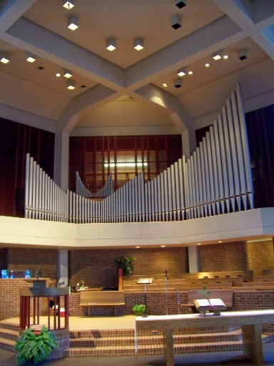 Notes: The former 1500-seat sanctuary and the rest of the church plant were destroyed in a fire set by arsonists on Christmas Eve 1965. The new church plant and contemporary 1400-seat sanctuary were dedicated on Easter Sunday 1968. The organ is installed across the front.