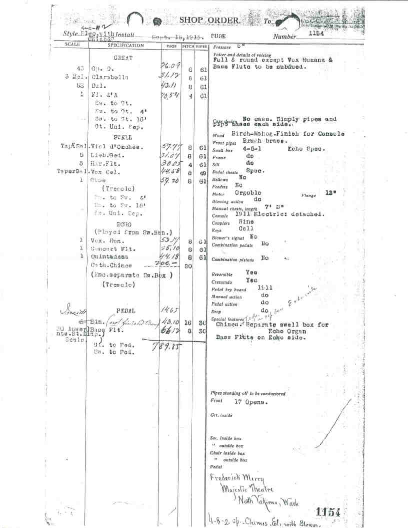 Great 8 Open Diapason 8 Clarabella 8 Gemshorn 8 Dulciana 4 Flute d'Amour Tremolo Sw to Gt 16-8-4 Echo to Gt 16-8-4 Gt to Gt 4 Gt Unison Sep. Swell 8 Lieblich Gedeckt 8 Viol d'Orchestra 8 Vox Celeste 4 Harmonic Flute 8 Oboe Tremolo Sw to Sw 16-4 Swell Unison Sep. Echo 8 Concert Flute 8 Quintadena 8 Cornopean 8 Vox Humana Tremolo Cathederal Chimes Or. Bar Bells Echo to Echo 16-8-4 Sw to Echo Echo Unison Sep. Pedal 16 Open Diapason 16 Bourdon 8 Bass Flute Gt to Ped Sw to Ped Echo to Ped Traps Bass Drum with single beat and double tympany beat actions to be