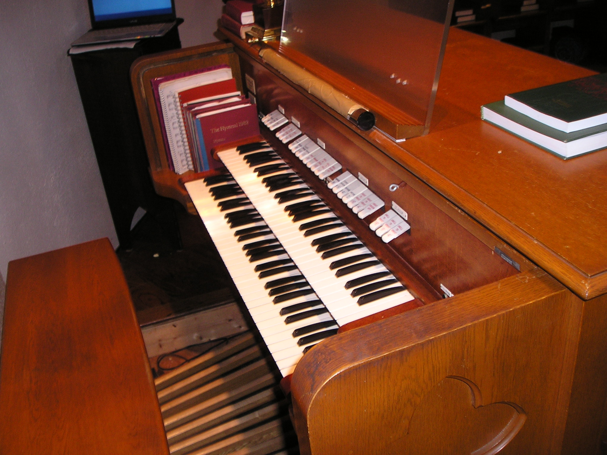 "Pipe organs over the centuries have been built with various methods by which the action of depressing a key results in wind entering a pipe and making a sound. The Estey organ at Emmanuel College retained its original tubular-pneumatic action, a system developed in the mid-19th century that moves compressed air supplied by bellows from the keys to the pipes through small tubes. With the increased availability of electricity, by the end of the 19th century electro-pneumatic action was perfected, a system that uses an electric blower and electric current controlled by the keys to open air valves under the pipes. Electro-pneumatic action is considerably more reliable. The most important element in the installation of St. Andrew's new organ was the conversion of the action from tubular-pneumatic to electro-pneumatic. To coordinate with the new action, the organ was fitted with a new two manual console from the Klann Organ Supply Company of Waynesboro, Virginia.