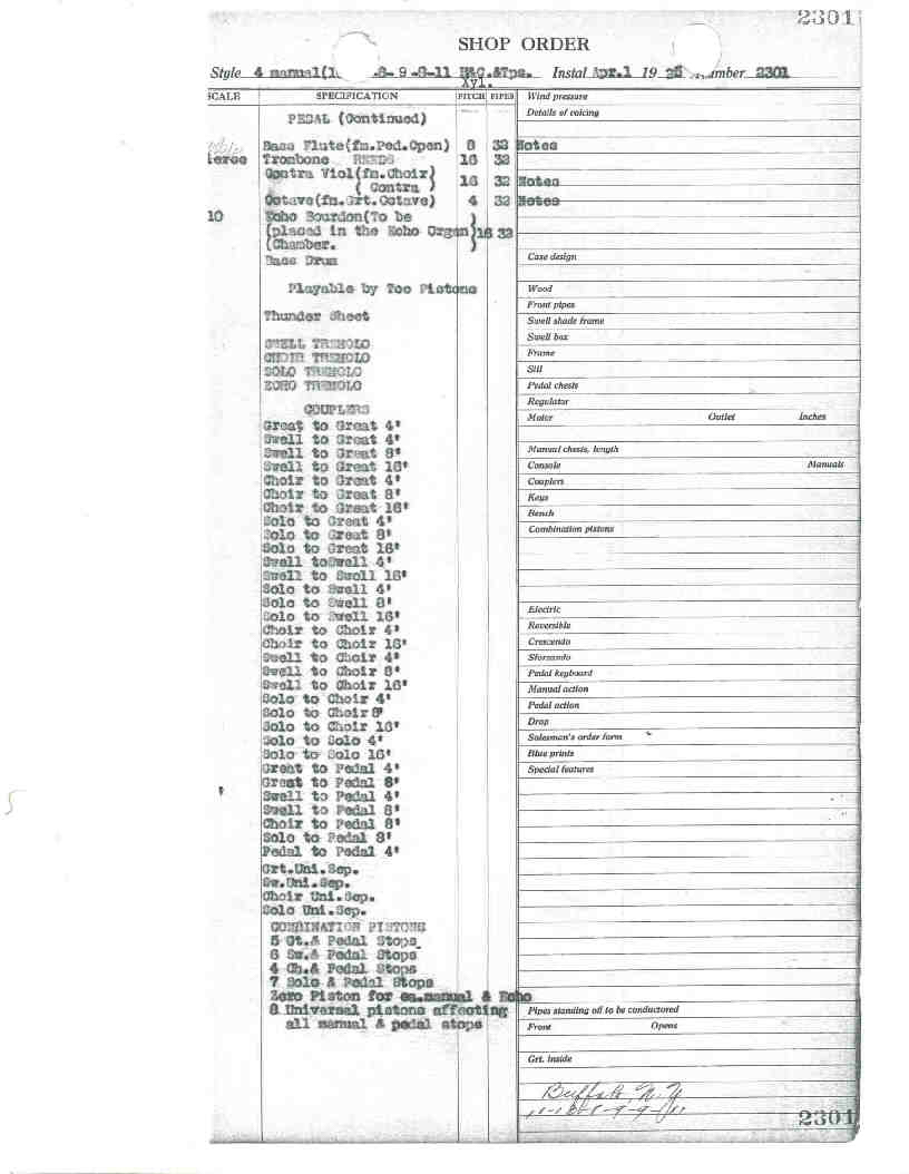 Choir 16 Contra Viol 8 Violin Diapason 8 Muted Viol 8 Muted Celeste (TC) 8 Clarabella 8 Unda Maris 4 Flute d'Amour 8 Clarinet Tremolo Pedal 32 Resultant 32 Bourdon 16 Open Diapason 16 2nd Open Diapason (Gt) 16 Bourdon 16 Lieblich Gedeckt (Sw) 16 Echo Bourdon 16 Contra Viol (Ch) 8 Bass Flute 4 Octave Bass Drum Thunder Sheet |