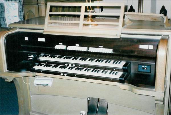 The console was originally in the center of the rear gallery and faced the rear window. It has since been turned 90 degrees to the right so that the organist faces across the gallery with their right side facing the altar.