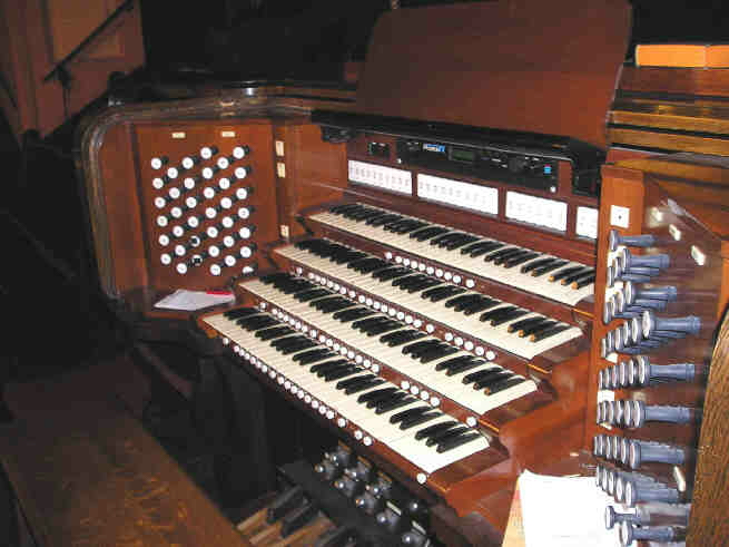 | Great 16 Pommer 8 Principal 8 Gemshorn 4 Octave 4 Pommer 2 Superoctave IV Fourniture Chimes Swell 16 Gedeckt 8 Gedeckt 8 Salicional 8 Celeste (TC) 4 Principal 4 Hohlflote 2 2/3 Nasard 2 Blockflote 1 3/5 Tierce III-V Plein Jeu 16 Trompette 8 Trompette 8 Oboe 4 Oboe-Clarion Tremolo Solo 8 Bombarde 8 Clarinet 8 English Horn Tremolo |