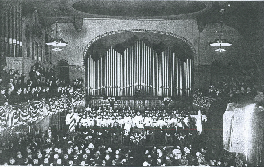 There have been few occasions in the history of this country when a President of the United States or a President-elect ha dedicated a new church organ. One of them took place at the Metropolitan Temple, Seventh avenue and Fourteenth street, New York, Sunday, when President-elect Taft was the principal speaker at the dedicatory exercises of the new McKinley Memorial Organ. This instrument was built by the Estey Organ Co. It costs $8000, and Andrew Carnegie contributed largely to the fund for the purchase of the instrument. A picture of the interior of the church, showing the organ, President-elect Taft and other celebrities present, is shown on this page. Long before 8 o'clock, the hour scheduled for the exercises to begin, the temple was filled to capacity, and camp stools had to be brought in to accomodate those who could not find room in the pews. On the outside of the church a crowd that at one time numbered at least 2,000 begged in vain to get in. A squad of police was kept busy from 6 o'clock until the exercises were ended, at 10 o'clock P.M., keeping those on the outside away from the doors. Mr. Taft arrived at the church about ten minutes past the opening hour in the automobile of his brother, Henry W. Taft. With them was a third brother, Hoarce D. Taft, who conducts a school for bos at Waterbur, Conn. None of the guests of honor ascended the platform until after the arrival of the President-elect. Some of those guests were Col. John J. Cook, Elbridge H. Gary, Louis Klopsch, Melville E. Stone, Col. H.O.S. Heistand, Ex-Secretary Lyman J. Gage, Robert Watchorn, John M. Cornell, George J. Jackson and Samuel Bowne, who presided at the ceremonies. After the invocation by Bishop David A. Goodsell, a choir song, and prayer by the Red. Dr. James A. Buckley, Mr. Bowne introduced Mr. Carnegie as the first of the speakers. |